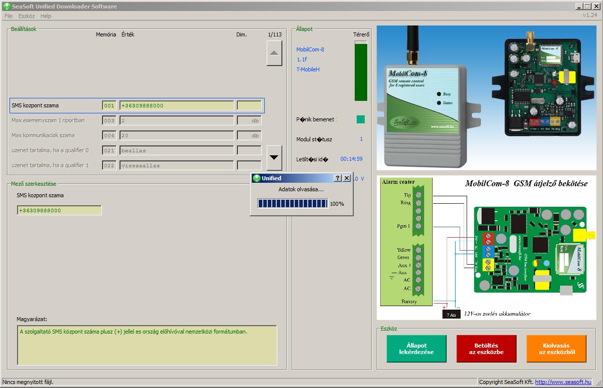 A MobilCom-8 ContactID átalakító modulnak egy feszültségmentes kontaktus bemenete is van, mely tetszőleges célú, szabadon konfigurálható tartalmú SMS üzenetek küldésére használható. Az ingyenes Unified univerzális letöltő szoftverünkkel a készülékeinket Windows-XP, Windows-7, Windows-8 és Windows-10 operációs rendszerek alatt lehet felprogramozni. A készülékek felprogramozásához sem drivert, sem a Unified szoftvert külön feltelepíteni nem kell, a letöltő szoftver azonnal futtatható. Mivel a szoftverünkkel más készülékeink is felprogramozhatók, így csak USB porton keresztül csatlakoztatott, és általa automatikusan felismert valamely modulunkkal együtt használható. A készülék minden memóriahely tartalma a memória táblázata használata segítségével SMS-ek küldésével is változtatható dedikált telefonszámról.